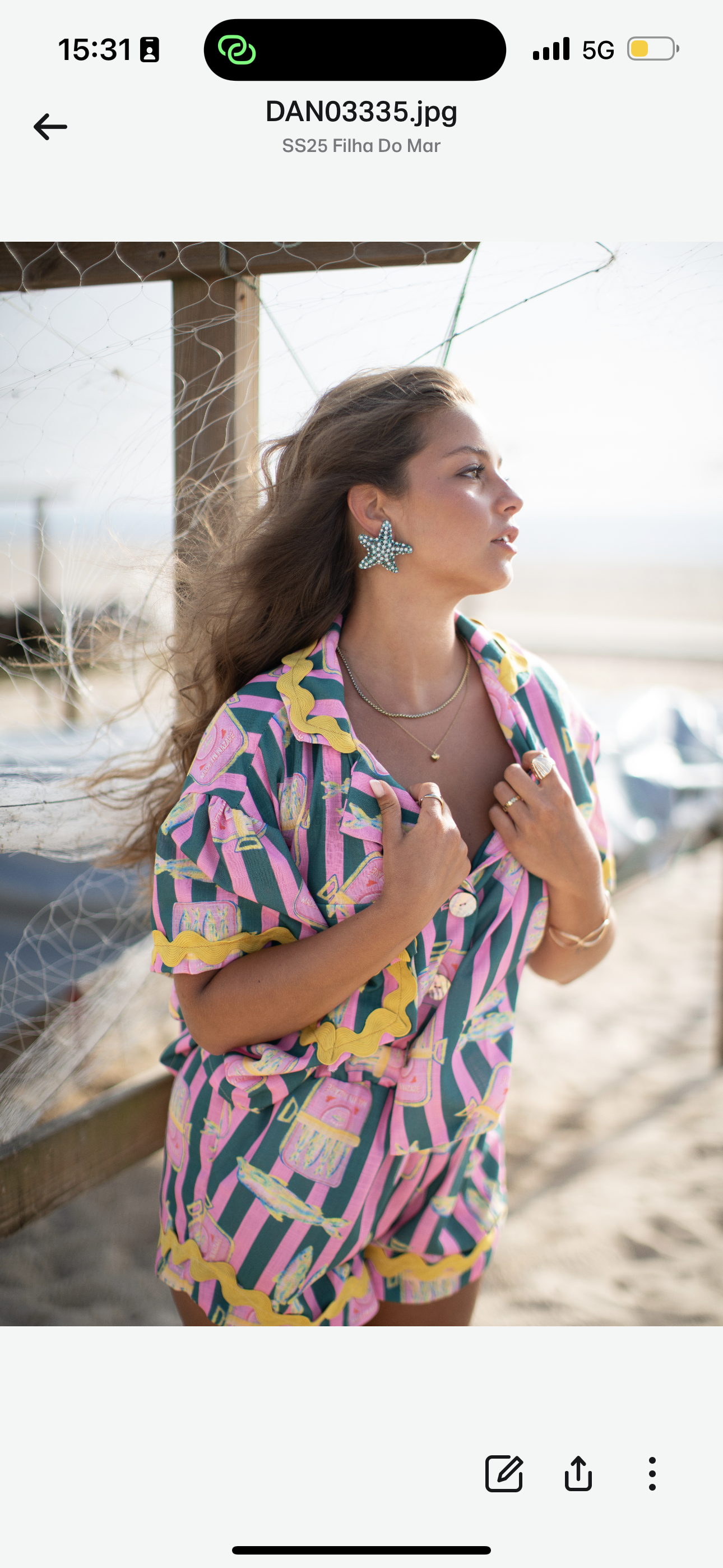 Conjunto camisa cropped + calções com elástico na cintura em linho sublimado com botões de madre pérola e grega amarela